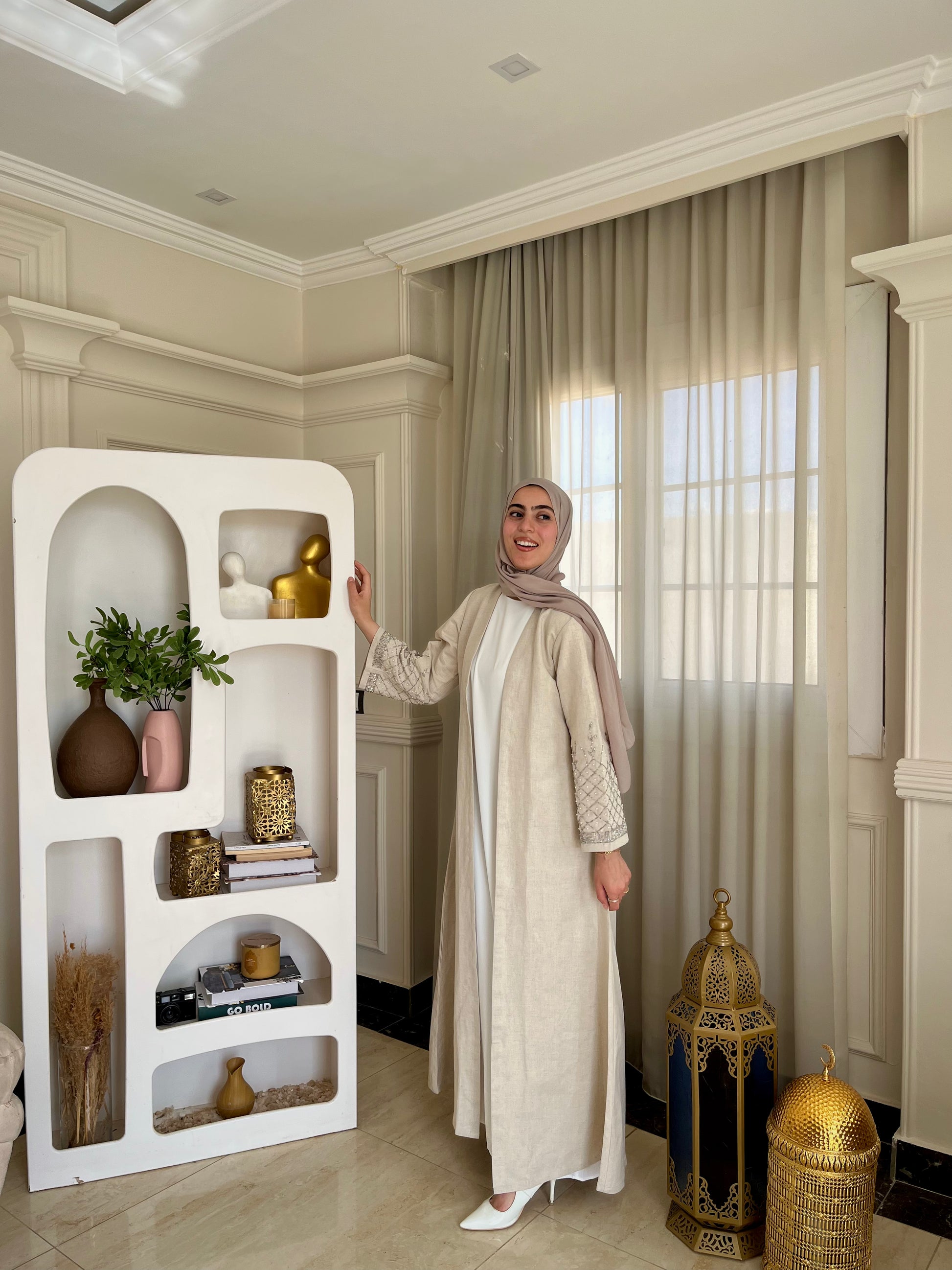 Pure Linen Open Abaya – Structured yet airy, with a graceful natural drape Matching Inner Slip Dress – Soft, modest, and perfectly layered underneath Premium Chiffon Hijab – Lightweight, flowy, and effortlessly elegant