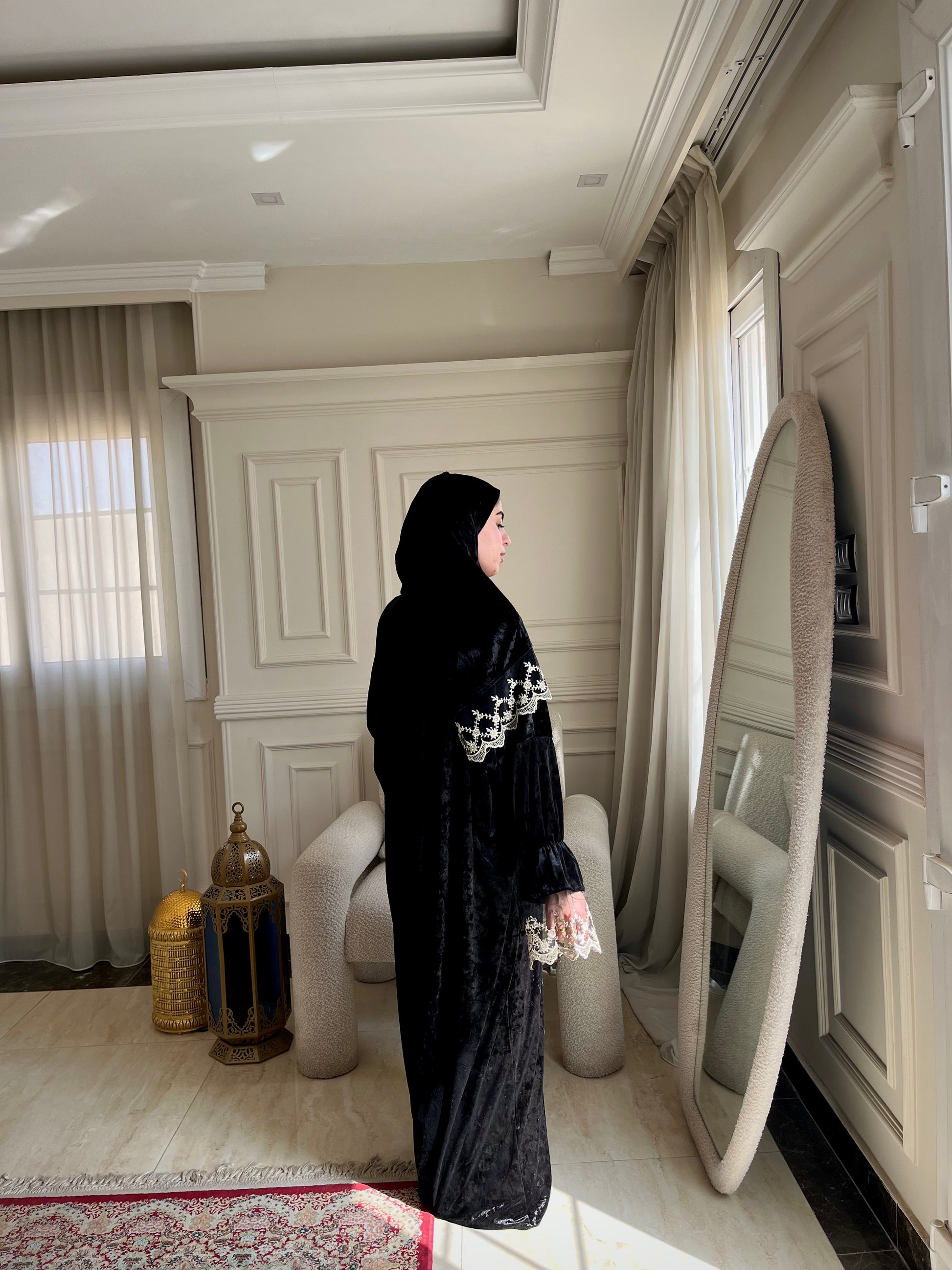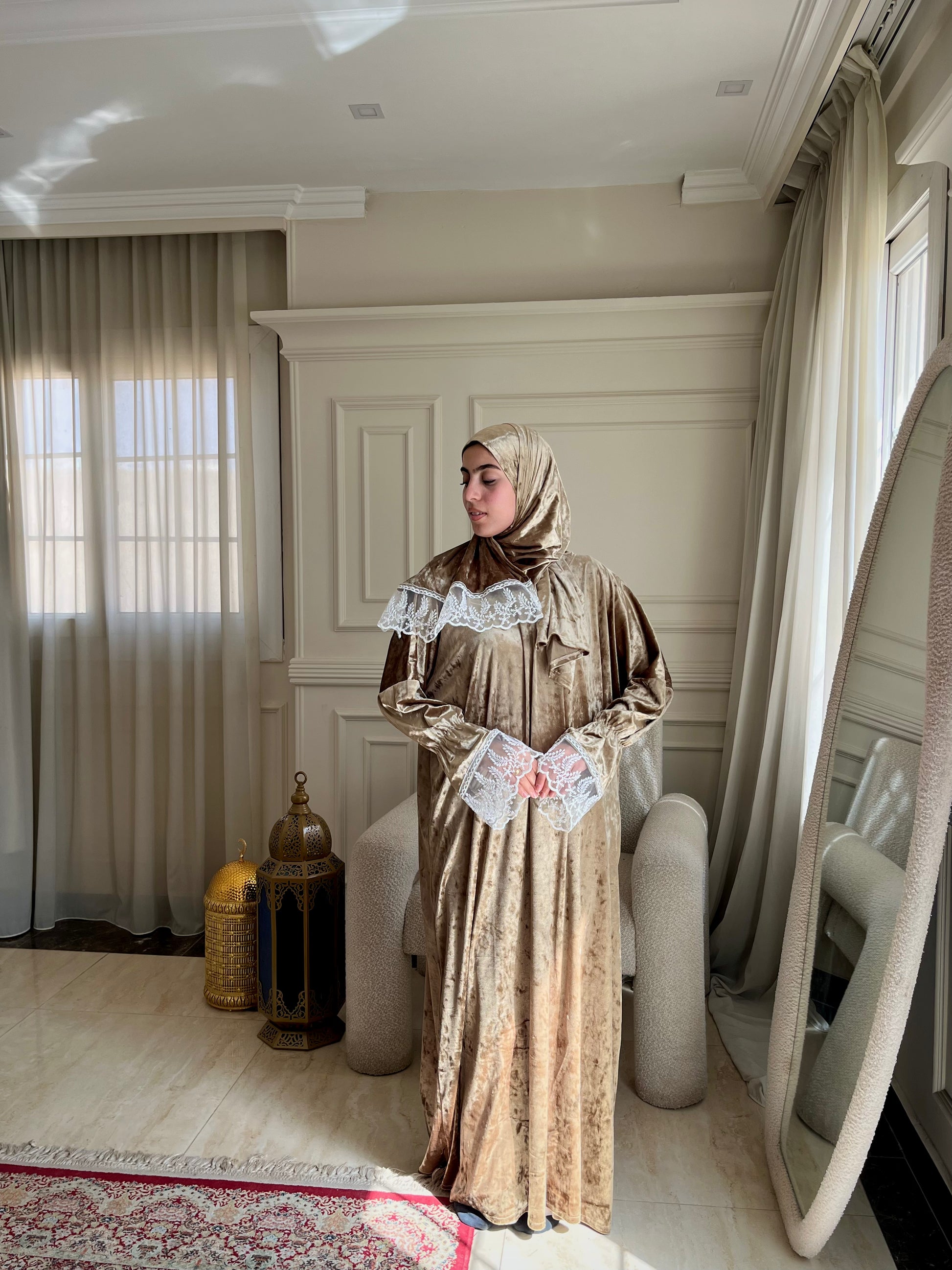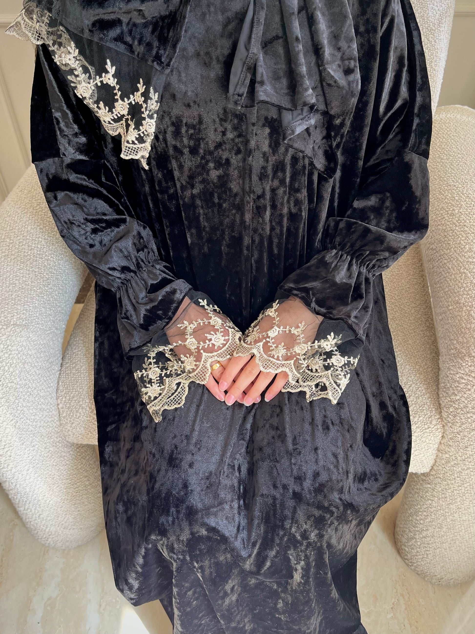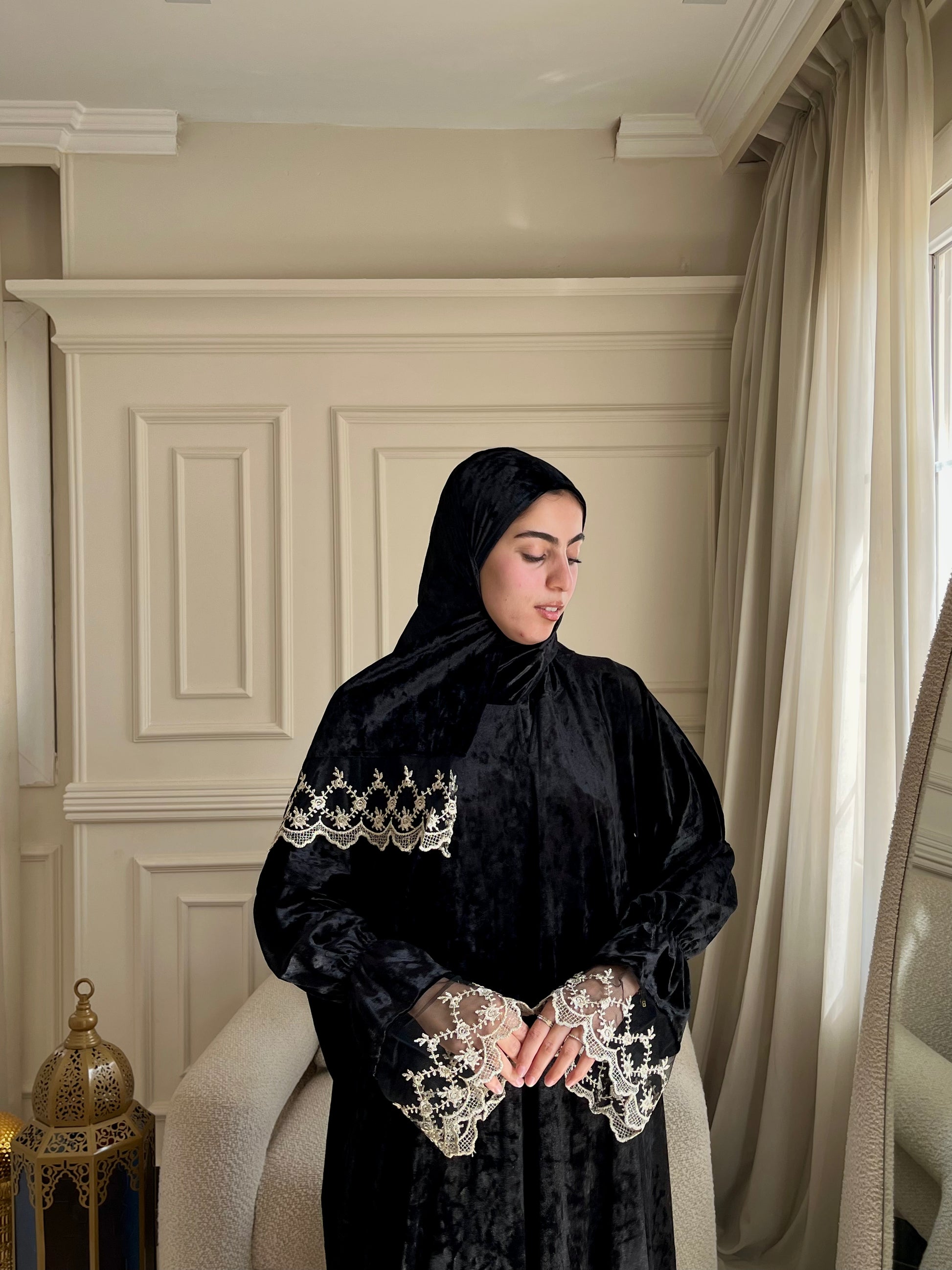 Why You’ll Love It • Premium Jangah velvet with soft sheen • Elegant structured drape • Intricate lace cuffs & trim • Full coverage for comfortable salah • Opaque & non-sheer • Designed for special prayer moments
