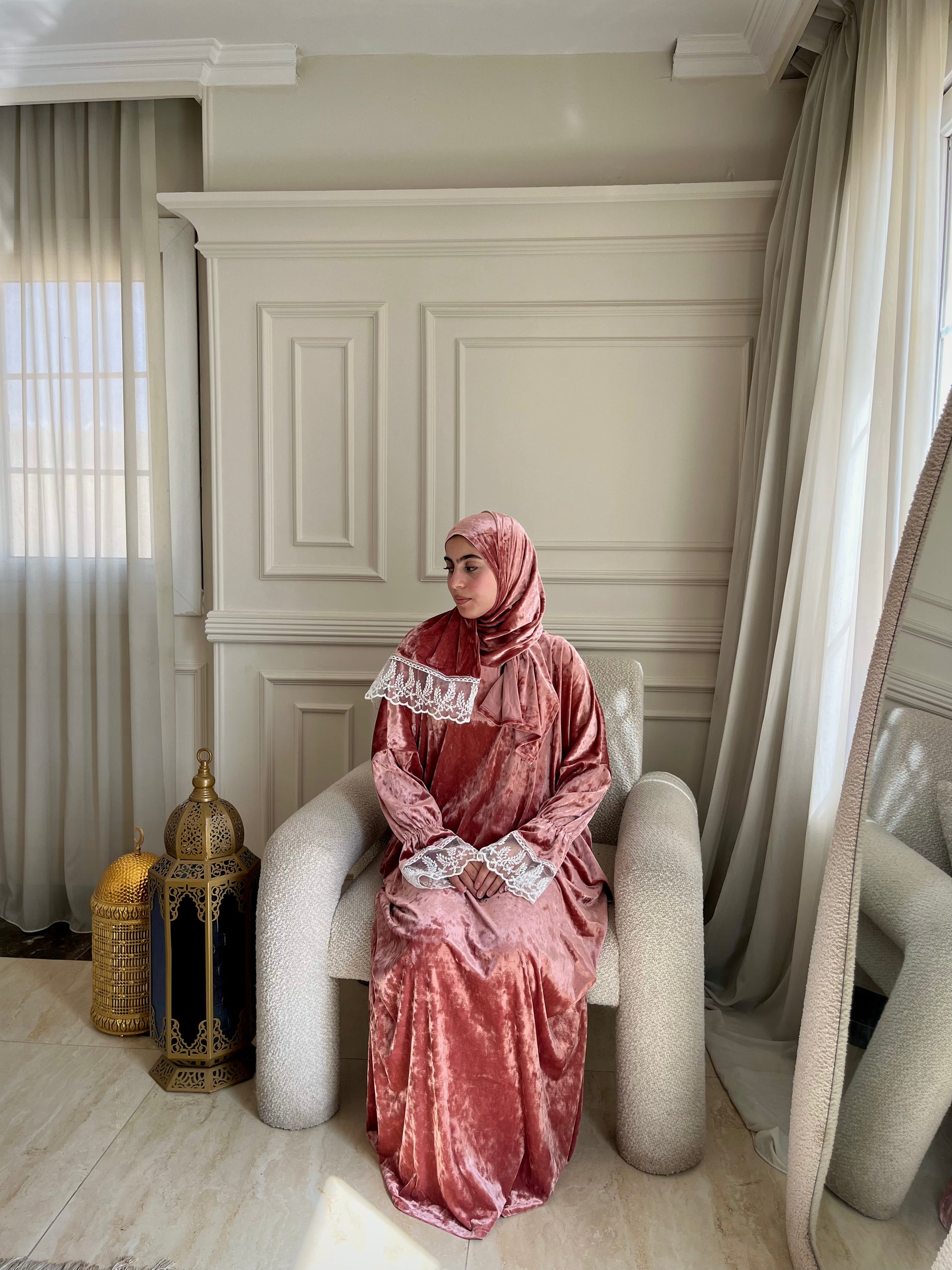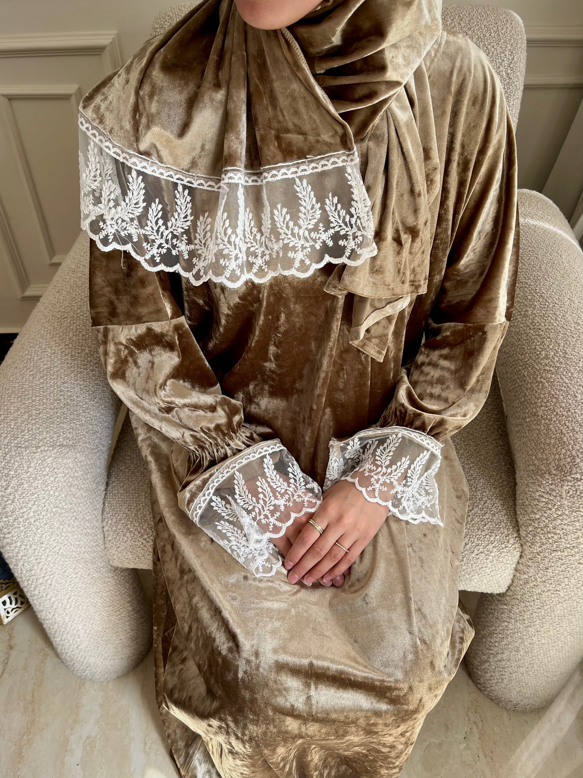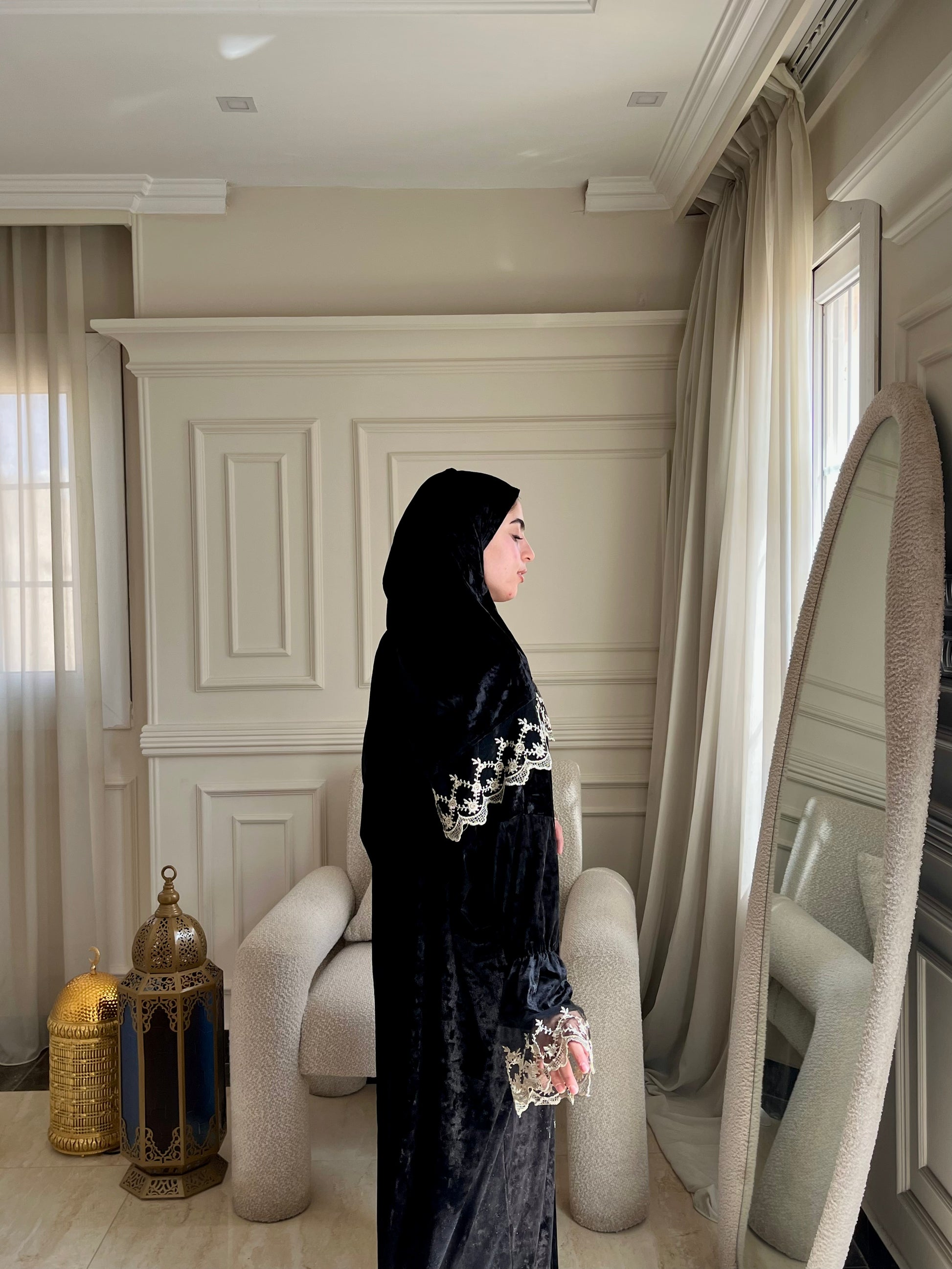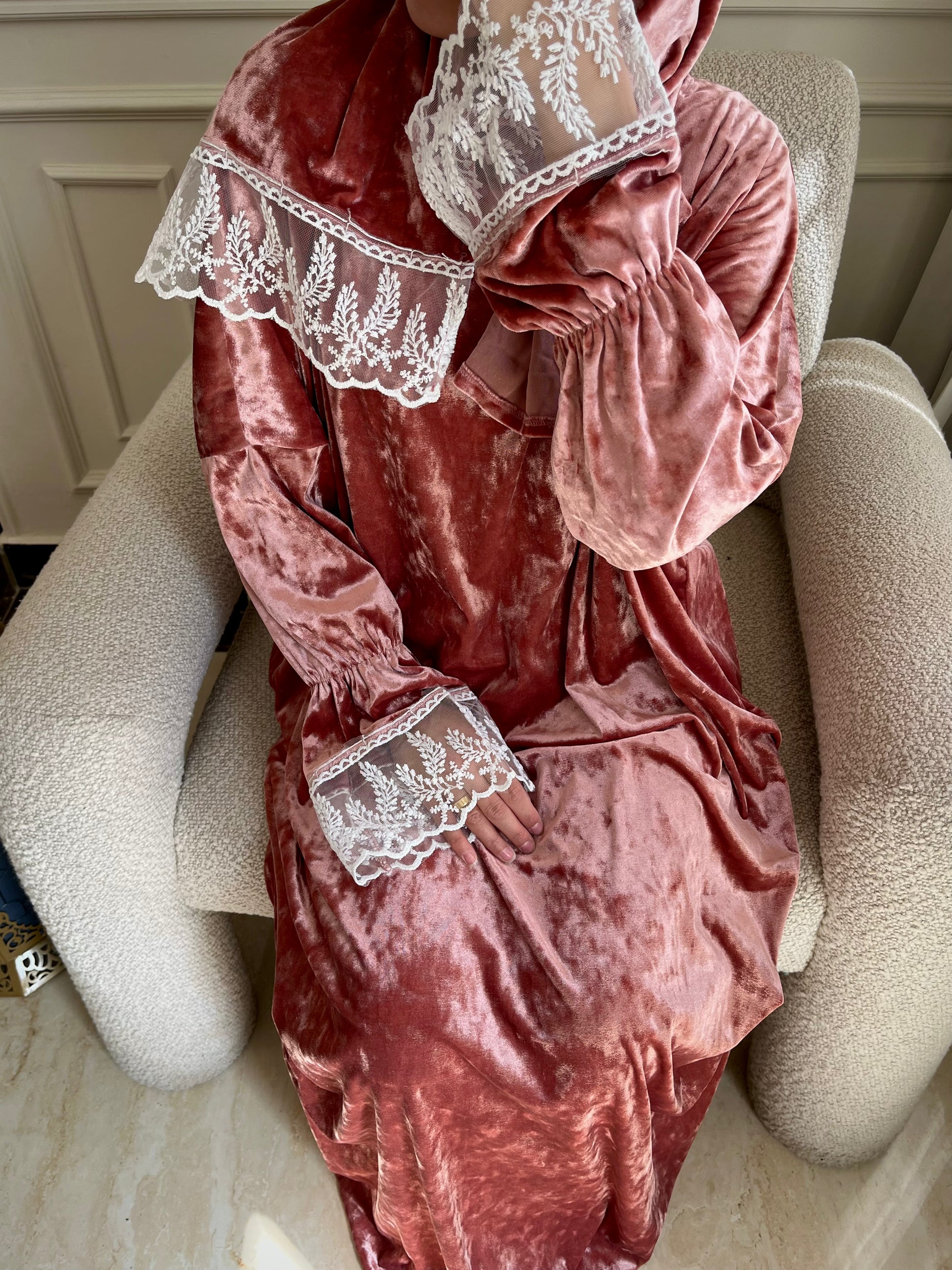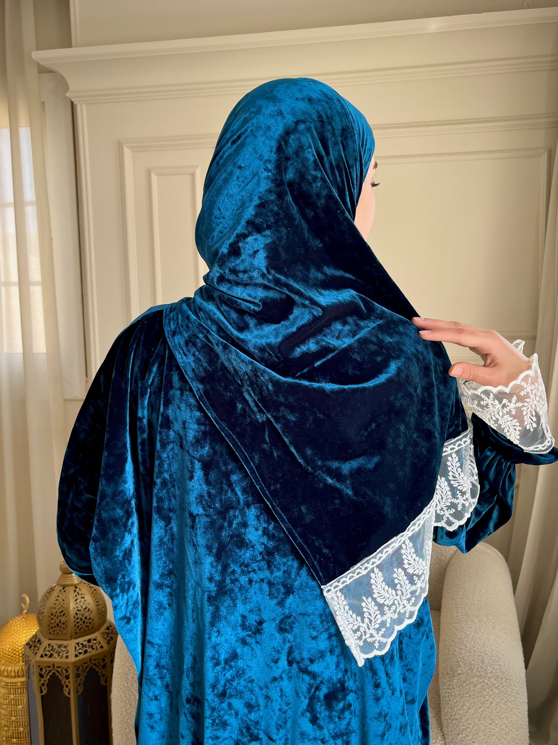 Why You’ll Love It • Premium Jangah velvet with soft sheen • Elegant structured drape • Intricate lace cuffs & trim • Full coverage for comfortable salah • Opaque & non-sheer • Designed for special prayer moments